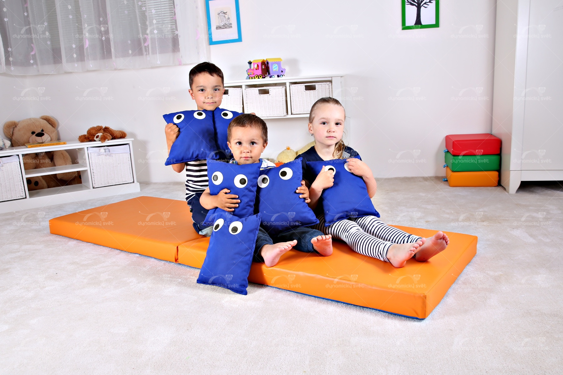 Polštářky plněné molitanovou drtí, potah z odolné směsové látky. Každý polštářek má jinak našitá očka, lze hrát různé hry a trénovat oči. Rozměr polštářku 25 x 20 x 5 cm. V sadě 6 kusů.